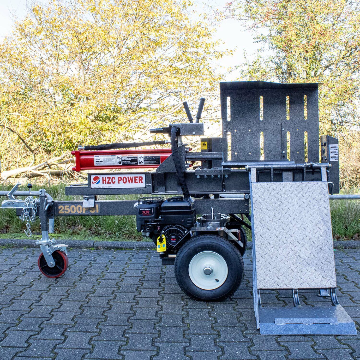 El partidor de troncos de 25 t (HS25205) está equipado con un fiable motor de gasolina Briggs&Stratton (6,5 CV, XR950). El motor está equipado con un par bruto de 12,88 Nm y 208 cc.
